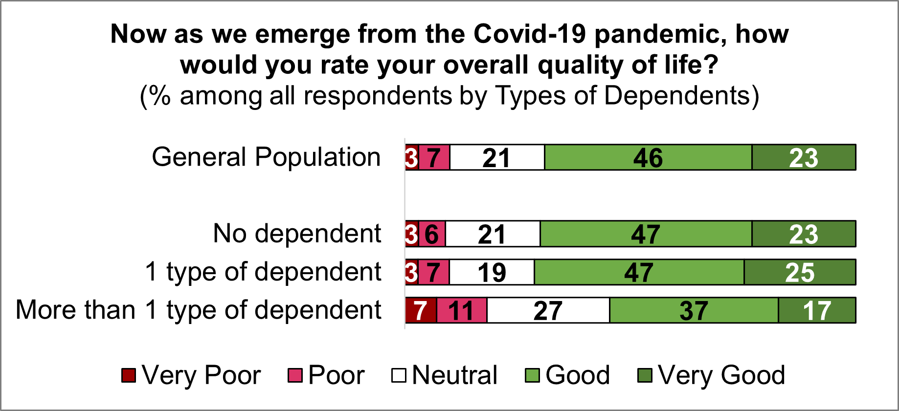 Compared to the general population, respondents with multiple dependents (e.g., elderly seniors as well as children in the household) were more likely to rate their overall quality of life now to be “Poor” or “Very Poor” (18% for those with multiple dependents, compared to 10% for the general population).