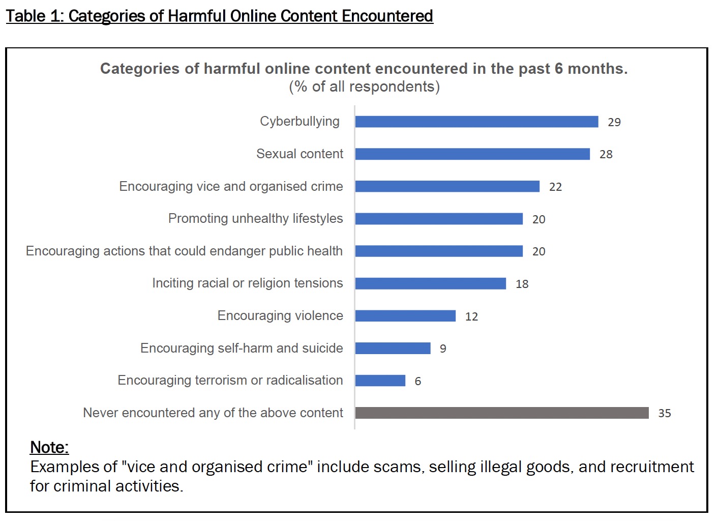 About two-thirds (65%) of Singapore users had encountered harmful online content, with the most common types of content being cyberbullying (29%) and sexual content (28%). Other examples include content which promotes illegal activities (22%), racial or religious disharmony (18%), violence (12%) and self-harm (9%)(see Table 1 below for details). Half (49%) of the parents surveyed also reported that their children encountered harmful online content, particularly sexual content (20%) and cyberbullying (19%). The findings indicated that encounters with such harmful online content, and especially sexual and cyberbullying content, were relatively common among both adults and children in Singapore.