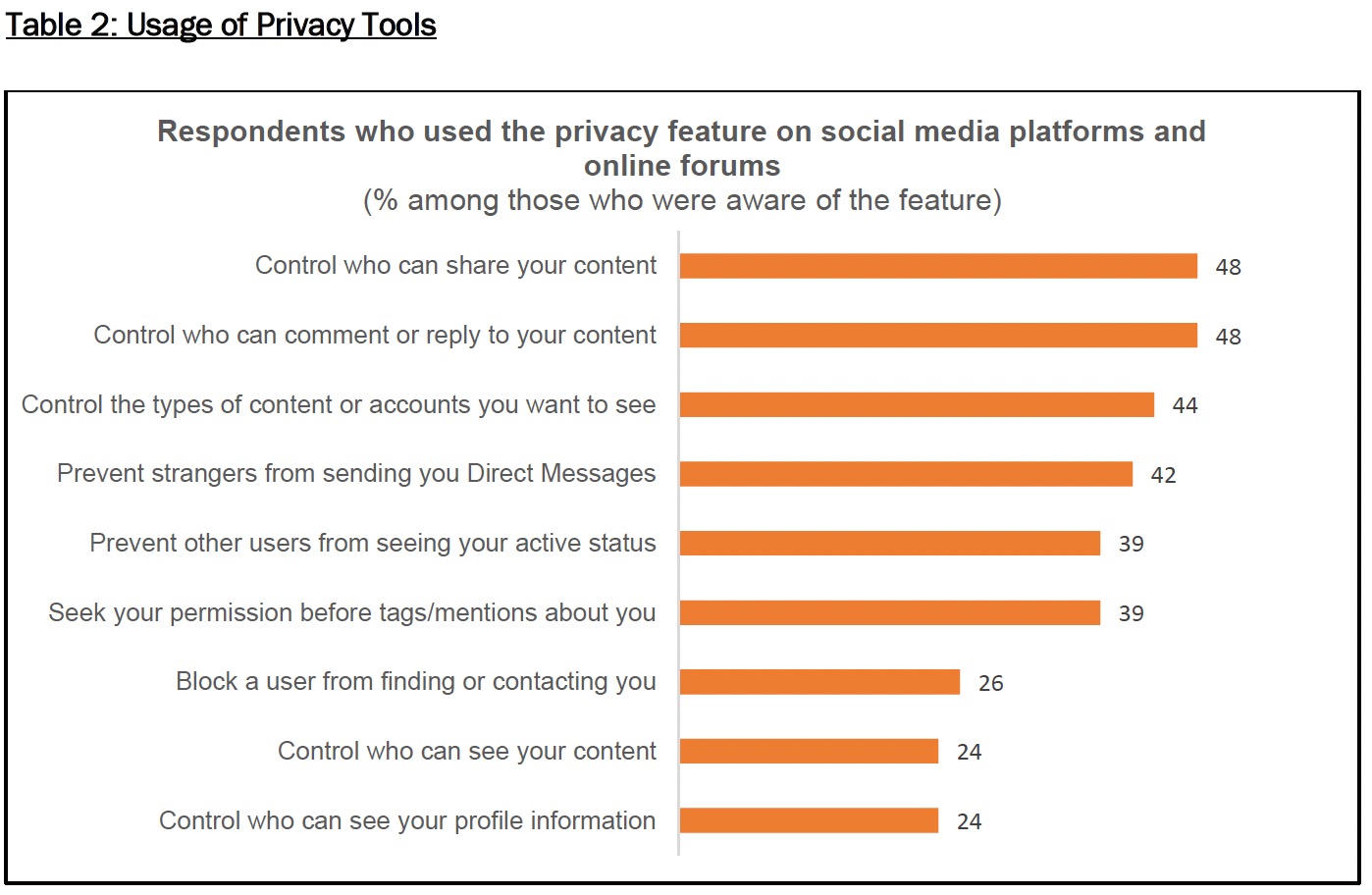 Despite having awareness of privacy tools, there remained a gap in respondents’ usage of the tools. For respondents who did not make use of some of the privacy tools that they were aware of, top reasons cited were that they had not encountered issues which required them to use privacy tools (45%), or that they had never thought of doing so (28%). (see Table 2 on the prevalence of the use of various privacy tools).