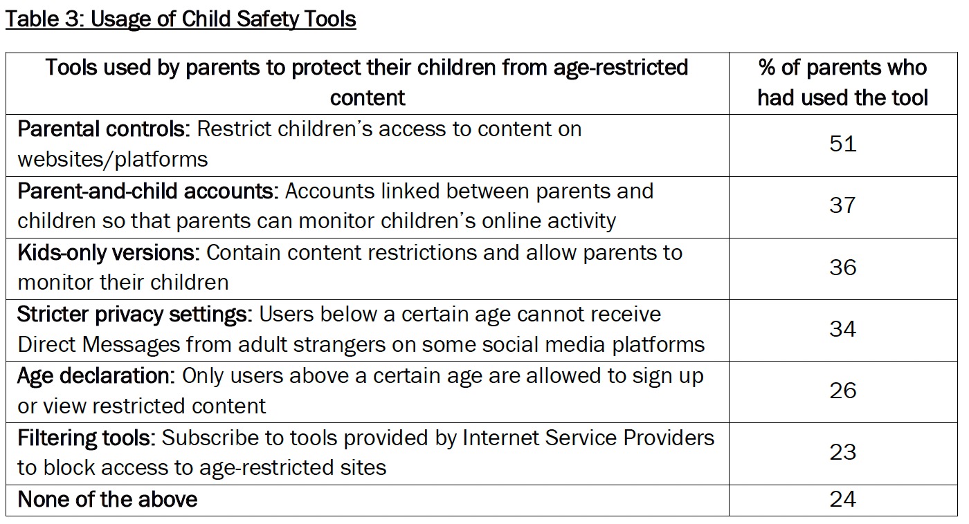 Half (51%) of parents surveyed had used parental controls to restrict the types of content that could be accessed by their children, but usage was lower for other child safety tools.