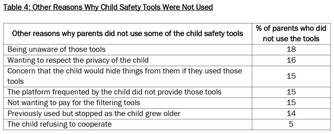 Among parents who did not use some of these tools, 3 in 10 (30%) indicated that their children had limited online access, while 2 in 10 (22%) trusted that their children could handle themselves online. The rest had other concerns on use of these tools. (see Table 4 below on why child safety tools were not used).