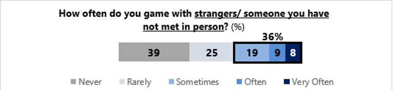 While the majority of youth respondents (64%) never or rarely played online games with strangers, about one-third of them (36%) played games with strangers sometimes or frequently. Some 14% had also engaged strangers outside of gaming [3]. Such behaviour presents a risk of potential exposure to adult predators and online scams.